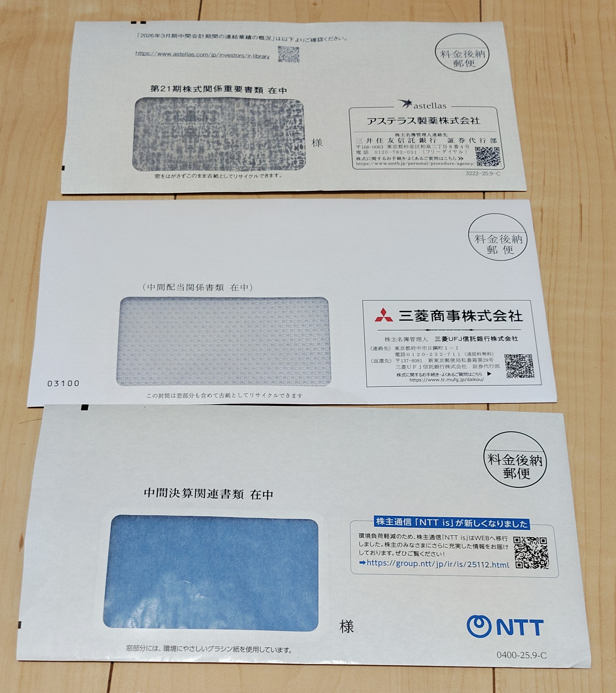 株式投資を始めて半年ほど。9月末〆の中間配当の計算書が届いてきました。今日はNTT・三菱商事・アステラス製薬です。